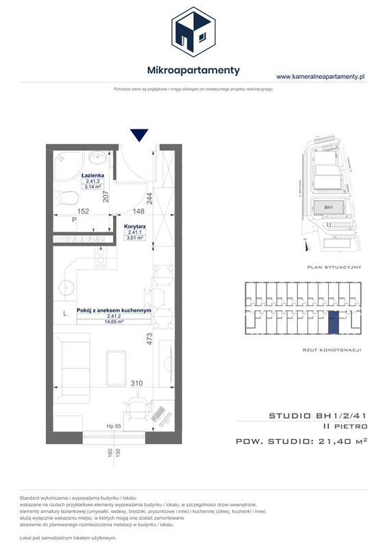 Przedmiotem sprzedaży jest lokal o pow. 21,40m2, położony na II piętrze. Lokal składa się z salonu połączonego z aneksem kuchennym (14,65m2), korytarza (3,61m2) oraz łazienki (3,14m2).