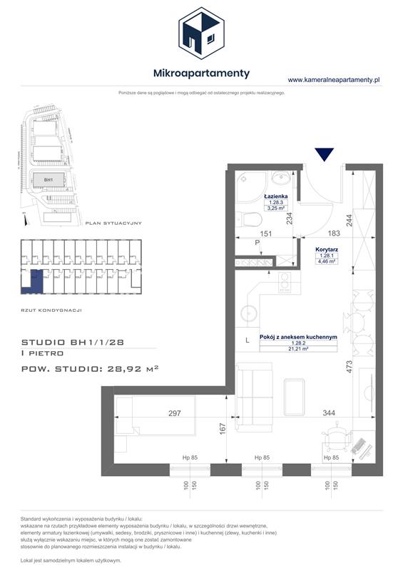 Przedmiotem sprzedaży jest lokal o pow. 28,92m2, położony na I piętrze. Lokal składa się z salonu połączonego z aneksem kuchennym (21,21m2), korytarza (4,46m2) oraz łazienki (3,25m2).