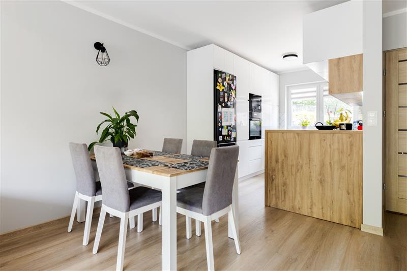 Ściany wygładzone, pomalowane w kolorze, w salonie jedna ze ścian wykonana w farbie strukturalnej. Na parterze podłoga winylowa, w łazience i wiatrołapie terakota, w pozostałych pomieszczeniach panele.