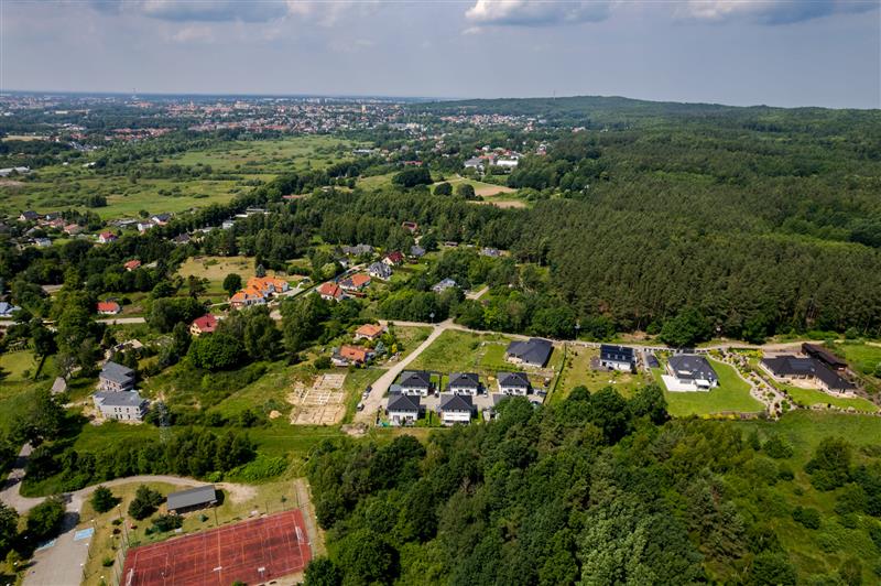 W około zabudowa niska jednorodzinna, niedaleko boisko „Orlik” oraz przystanek autobusu miejskiego.